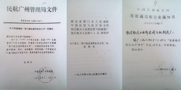1989年4月19日,荊門市人民政府、中國民用飛機(jī)開發(fā)公司、原航空航天工業(yè)部宏圖飛機(jī)制造廠和航空航天工業(yè)部六〇五研究所簽訂了《關(guān)于建立“荊門聯(lián)合通用航空公司”的合同書》;10月4日,原航空航天工業(yè)部發(fā)文(航改〔1989〕1562號(hào))同意成立荊門聯(lián)合通用航空公司(荊門通航最早名稱)。11月30日,中國民航局廣州管理局發(fā)文(穗管局專發(fā)〔1989〕027號(hào))同意籌建荊門通航;12月5日,中國民航局發(fā)文(民航通籌字第02號(hào))同意籌建荊門通航。
