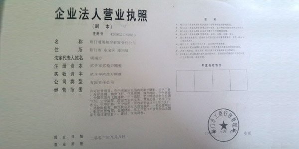 1990年7月2日,公司取得荊門市工商行政管理局頒發(fā)《企業(yè)法人營業(yè)執(zhí)照》(荊市工商企注冊(cè)號(hào)18011412-72/2),荊門通航正式成立,經(jīng)濟(jì)性質(zhì)為全民所有制企業(yè),注冊(cè)資本304萬元。三家股東單位為原宏圖飛機(jī)制造廠(后于2005年將相關(guān)權(quán)益轉(zhuǎn)給荊門宏圖特種飛行器制造有限公司)、中國民用飛機(jī)開發(fā)公司、荊門市交通運(yùn)輸局(后于2012年將相關(guān)權(quán)益轉(zhuǎn)讓給荊門聯(lián)合航空公司)。